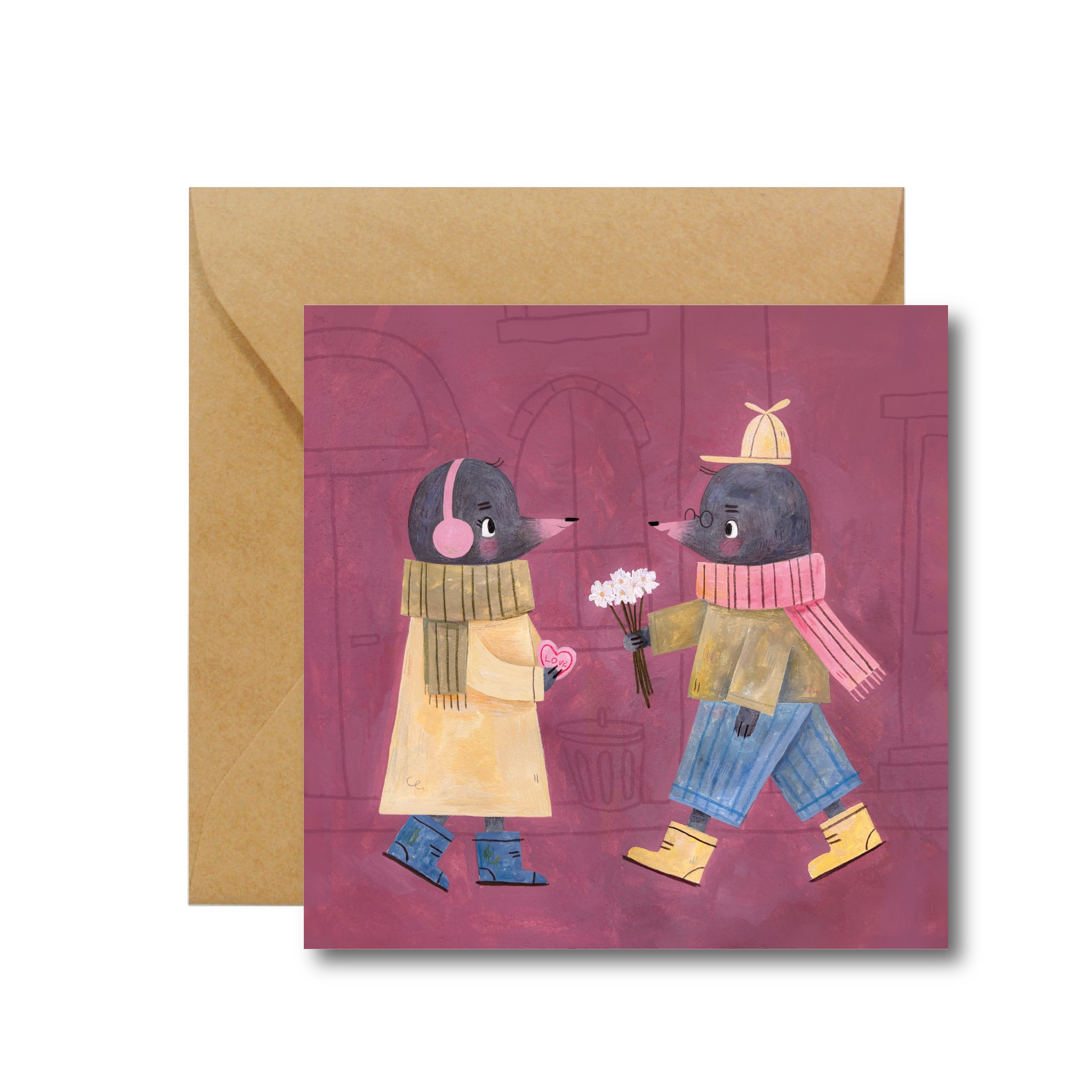 Piękna kartka dla bliskiej osoby, z zakochanymi krecikami.