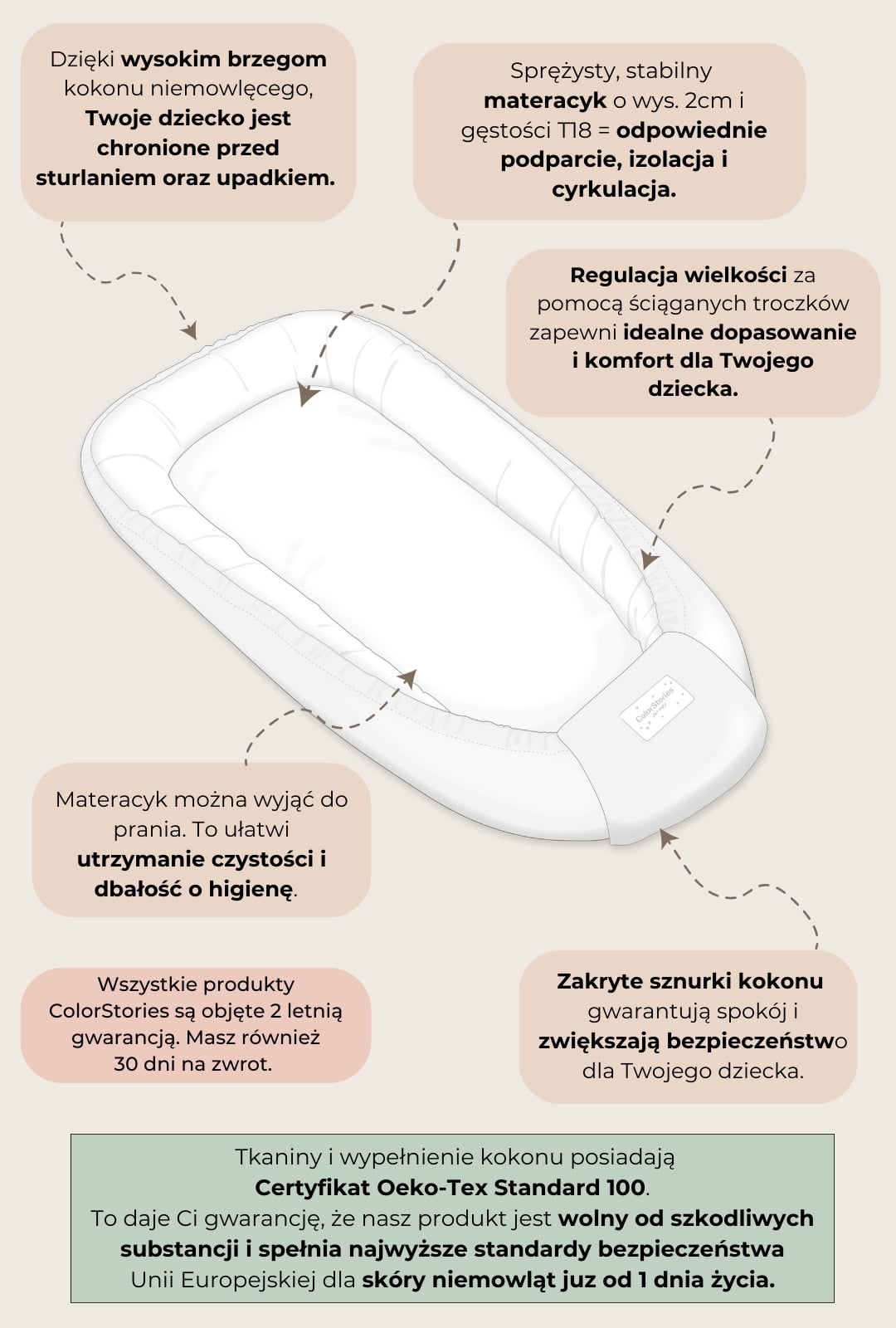 Kokon dla dziecka ColorStories to nie tylko piękny element wyprawki, ale przede wszystkim przyjazne i bezpieczne miejsce do wypoczynku dla Twojego dziecka. Każdy detal został starannie przemyślany, aby maluszek mógł cieszyć się maksymalną wygodą, a Ty spokojem i pewnością, że otacza go to, co najlepsze.