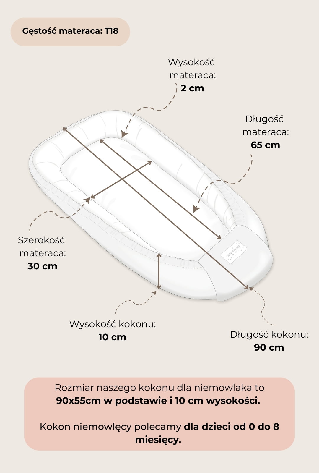 To model stworzony z myślą o noworodkach i najmniejszych niemowlętach. Jego otulający kształt (wymiar zewnętrzny: 83×45 cm, wewnętrzny: 66×33 cm) sprawia, że dziecko ma bezpieczne i przytulne miejsce do odpoczynku. Dzięki temu kokon świetnie sprawdzi się w małych przestrzeniach oraz w pierwszych miesiącach życia maluszka.