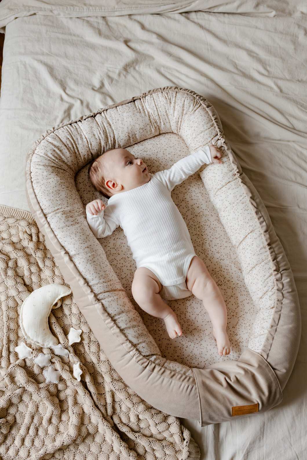 Wysokie, miękkie brzegi kokonu tworzą przytulne gniazdko, które delikatnie otula dziecko, pomagając mu się wyciszyć i poczuć bezpiecznie – tak, jak w ramionach mamy. To także naturalna bariera, która zapobiega przypadkowemu sturlaniu się niemowlęcia z powierzchni, na której odpoczywa.
