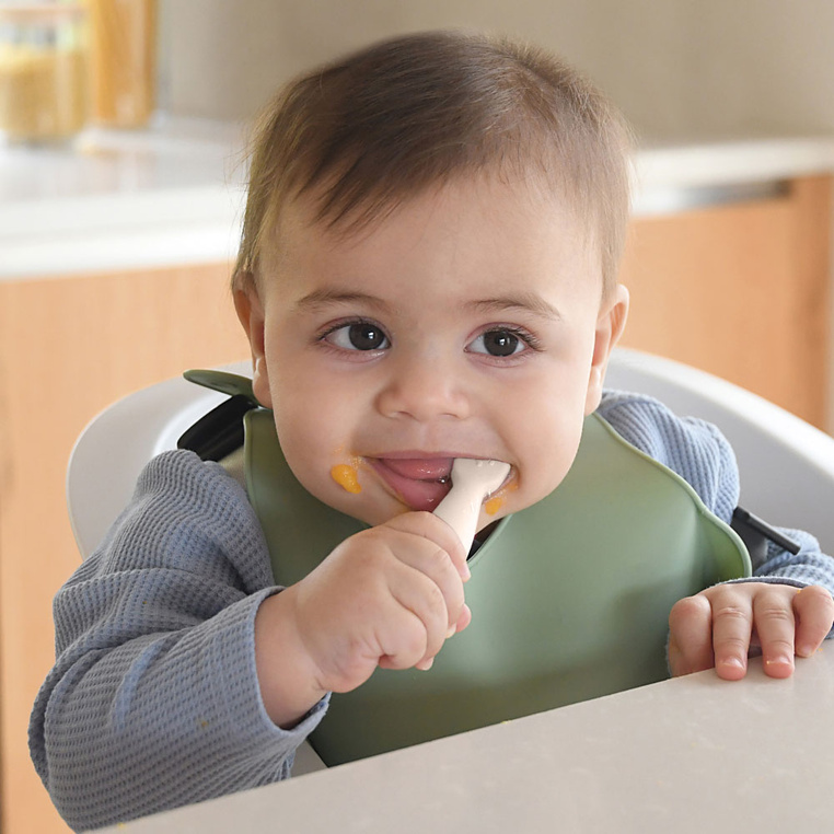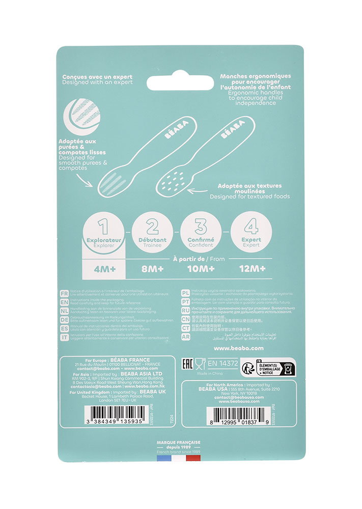 Zestaw dwóch innowacyjnych ergonomicznych pierwszych łyżeczek-gryzaków francuskiej marki BEABA zaprojektowany pod okiem specjalistów od żywienia niemowląt, aby wspierać rozwój i samodzielność maluszków. Łyżeczki wykonane zostały z ultraelastycznego silikonu, w pełni bezpiecznego dla delikatnych dziąseł i ust maluszka. Ich spłaszczony kształt z różnymi fakturami ułatwia przejście ze smoczka na łyżkę, zapewnia nabieranie optymalnych, małych porcji, dogodnych do połknięcia dla maluszka oraz stymuluje sensorycznie. Łyżeczki są tak samo zbudowane i wyprofilowane z obu stron, więc nie trzeba ich obracać. Jedna z nich ma fale, a druga wypustki. Spełniają się również doskonale w roli pierwszych gryzaków, przynosząc ulgę w trudnym okresie ząbkowania. Krótki, zaokrąglony uchwyt sprawia, że wspierają naukę samodzielnego chwytu już od 4. miesiąca życia (np. dłoniowy, pęsetowy i pięściowy). Nadają się zarówno dla dzieci prawo, jak i leworęcznych.