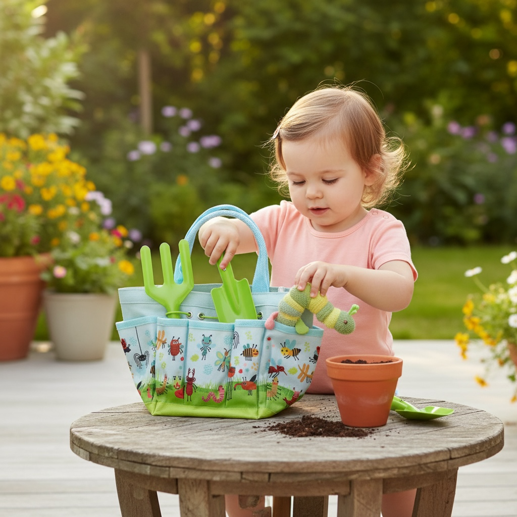 Poręczna torba dostosowana do małych rąk Torba zaprojektowana z myślą o dzieciach jest lekka, kompaktowa i łatwa do przenoszenia. Wygodny uchwyt pozwala nawet najmłodszemu samodzielnie zabrać zestaw na działkę czy do przydomowego ogródka. Wymiary 16,5 x 13 x 24,5 cm to idealne proporcje dla małych rąk – nie za duża, nie za mała, w sam raz na przygodę.